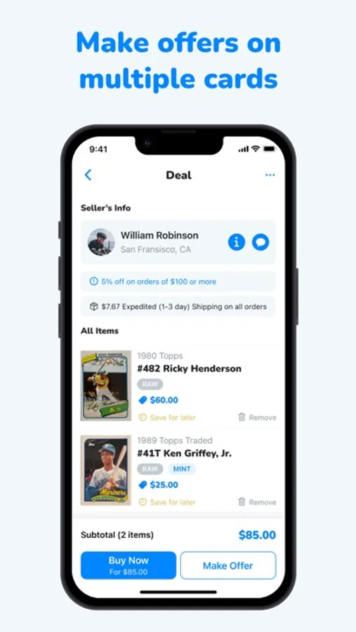 New in v2.0 of CollX is the Marketplace, where you can buy cards using a credit card, Apple Pay, CollX Credit, and your balance on the app. Use Deals to bundle multiple cards and make an offer to the Seller. As a Seller, you can utilize several shipping options, including CollX Envelope, where you'll get tracked shipping for as little as $0.75! Other Seller Tools include the ability to set a bulk discount and to decide if you want to accept Offers. Cards bought through the CollX Marketplace are also covered by the CollX Protect policy, where payments are only released when the cards arrive at the Buyer, giving peace of mind to both parties in a deal.