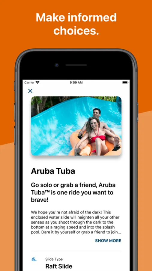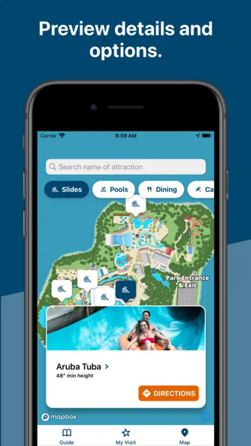 • Discover park amenities, including water slides, pools, cabanas, and dining