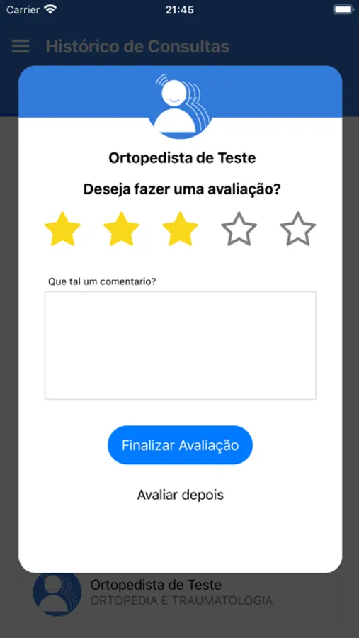 • Depois de duas horas da consulta, será notificado para fazer uma avaliação de sua experiência no atendimento, desde o agendamento até a consulta. Podendo indicar sugestões ou críticas.