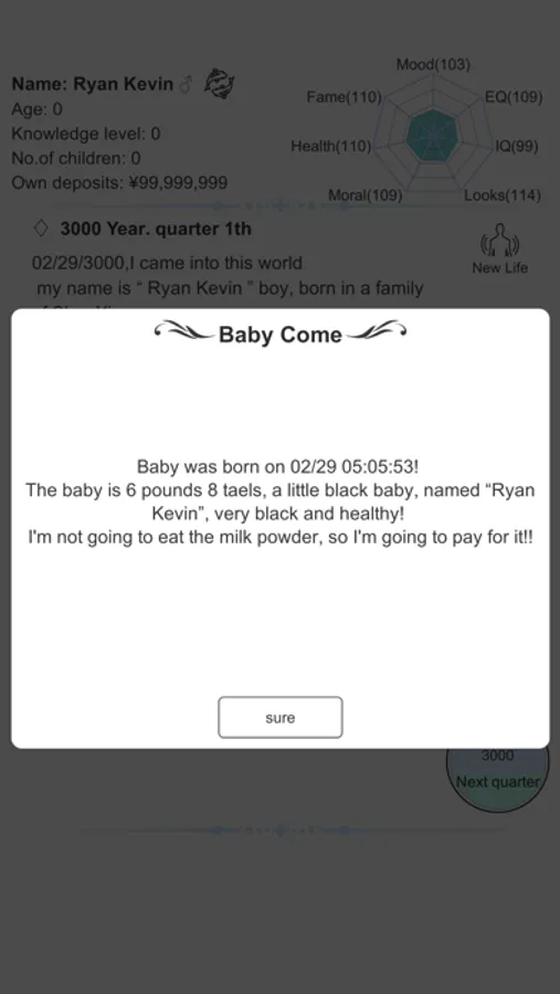 There are many special genes in the game, such as the high IQ gene, the twin gene, the octuplets gene, the high face gene and so on. If you can think it, I can do it!
