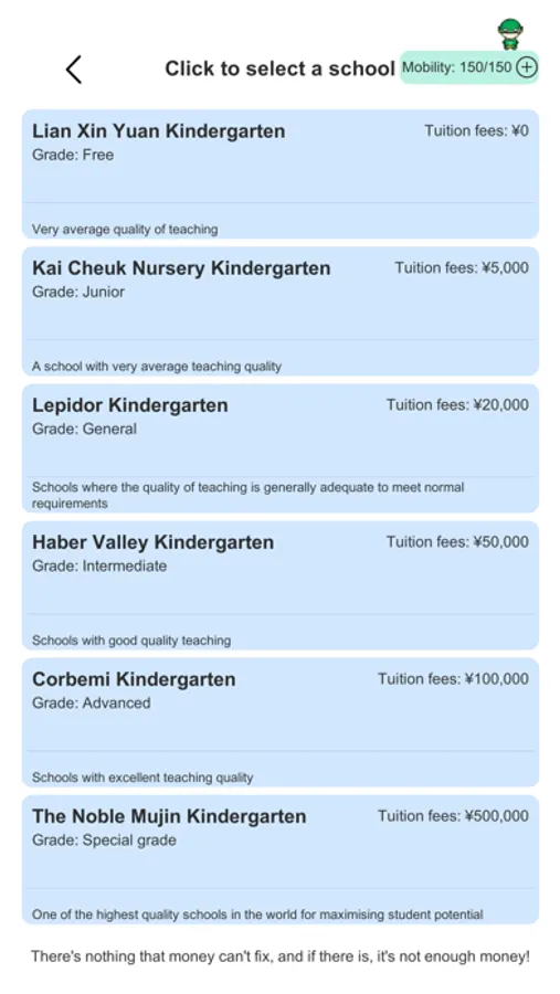 The game is designed with different levels of schools, so you can decide what school you want to go to based on your family's financial resources, and it's okay if you don't get into the university of your choice!