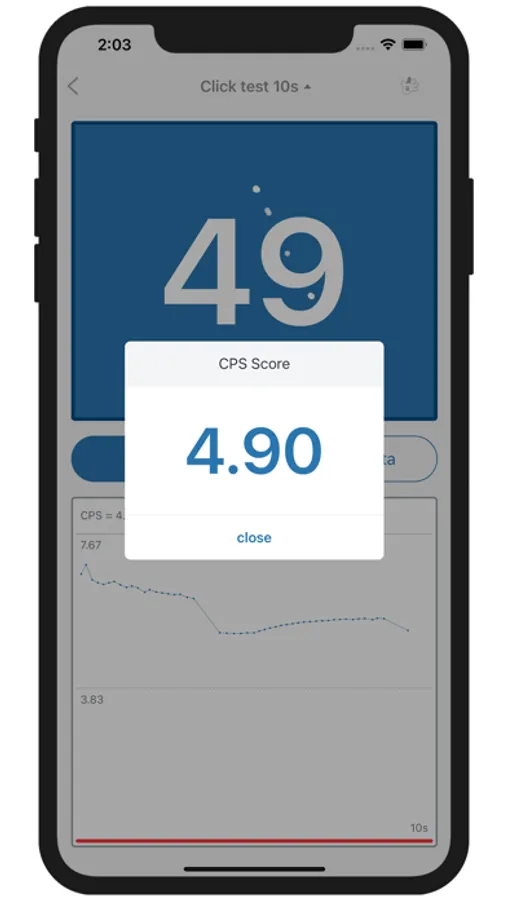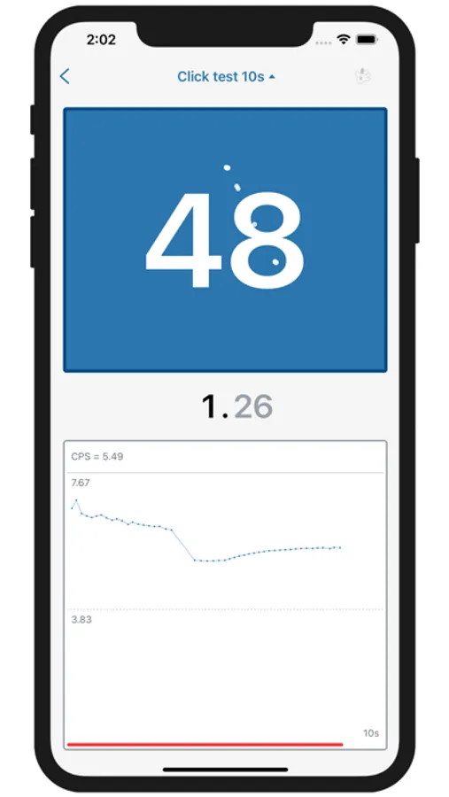 CPS-Test draws a chart of the click speed during the test so that you can see the change in the click speed over time. This is a very important function that helps to detect muscle fatigue, especially during prolonged testing.