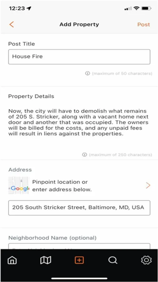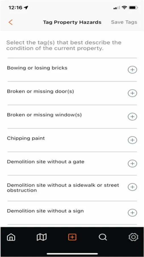 The app allows users to tag visible hazard(s) on pictures and videos taken from a mobile device and pin the blighted site using geolocation utilities. Additionally, users have the capability to share the identified blight from within the tool via email, SMS, and social media. The app allows users to follow reports of blight by bookmarking specific properties. Users may also view details of specific properties reported by any other users of the app.
