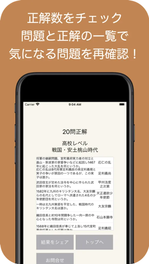 全問解答するとスコア画面に遷移します。正解数や選択したジャンルの問題リスト、その正解リストが表示され復習することが出来ます。