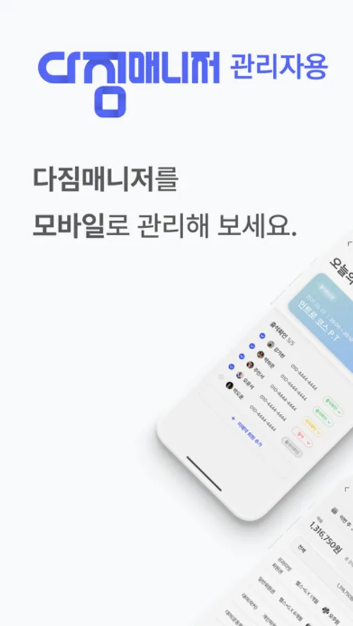 이제 다짐 매니저 고객용 관리자용 앱을 통해 간편하게 수업을 관리하세요.