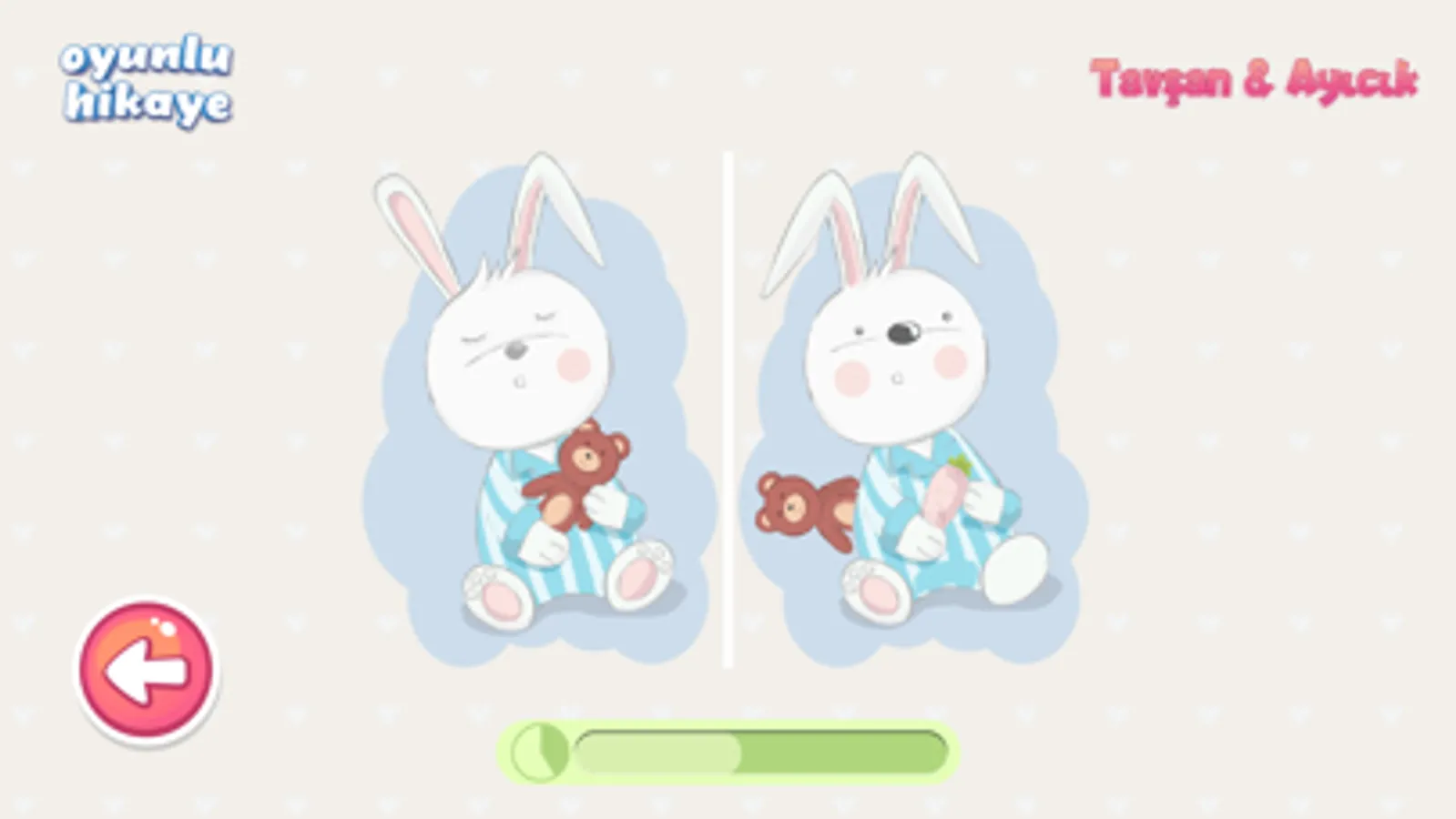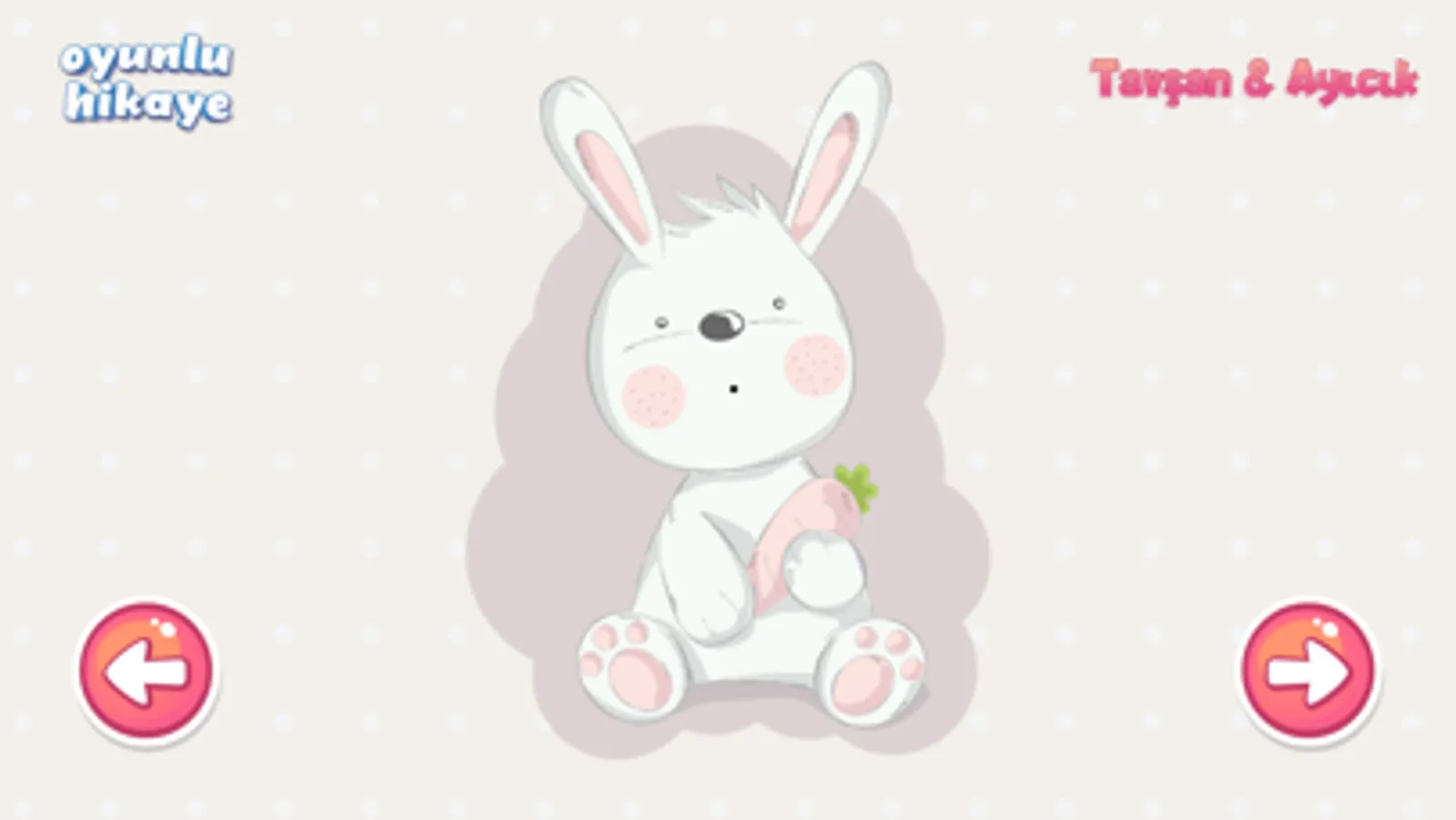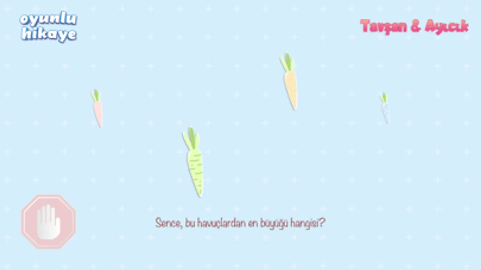 Oyunlu Hikaye 1 Tavşan & Ayıcık uygulamasında ,çocuklara sebze yemenin önemi anlatılmakta ve oyunlarla pekiştirilmektedir. Çocuğun sebze ile beslenmeyi sevmesi özendirilmektedir. Aynı şekilde odalarını toplamaları çeşitli oyunlarla özendirilmektedir.