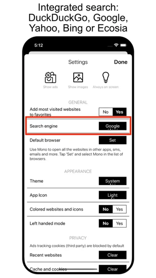 - Integrated search: DuckDuckGo, Google, Yahoo, Bing, Ecosia or Baidu百度