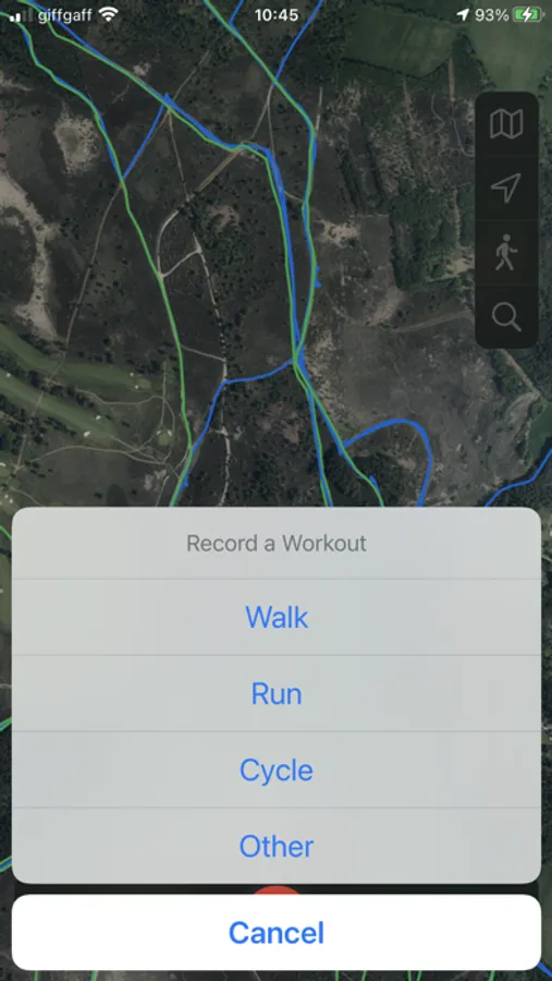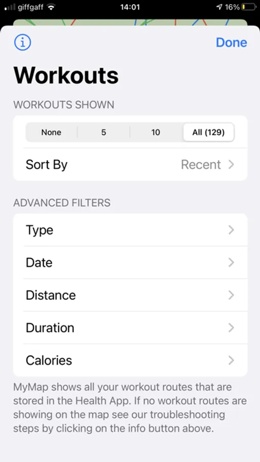 MyMap shows you all your workout routes on one map. You can also record Walks, Runs and Other workouts and see your route updating live on the screen. MyMap uses your phone's Health App to access and store workouts. All your new workout routes that you record are stored in the Health App on your iPhone. All your workout routes that are already in the Health App will be displayed on screen on the same map when you open the app.