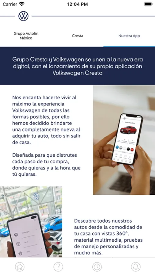 La primera App que te permite comprar un VOLKSWAGEN sin contacto humano, desde donde te encuentres en el momento que sea. Se trata de una evolución en el mundo automotriz que te evita llamadas, te ofrece transparencia y seguridad en el proceso de compra, así como las garantías que hacen de VOLKSWAGEN una marca excepcional. Mudamos toda la sofisticación de nuestra marca al universo digital.