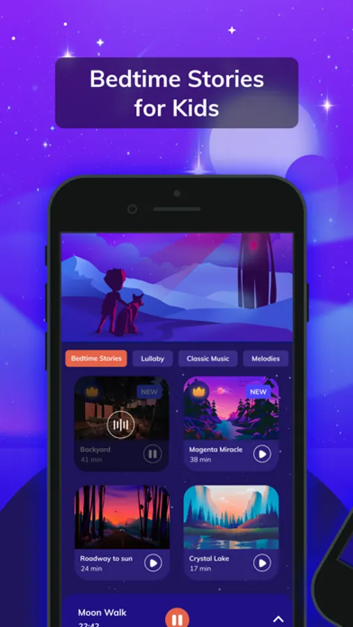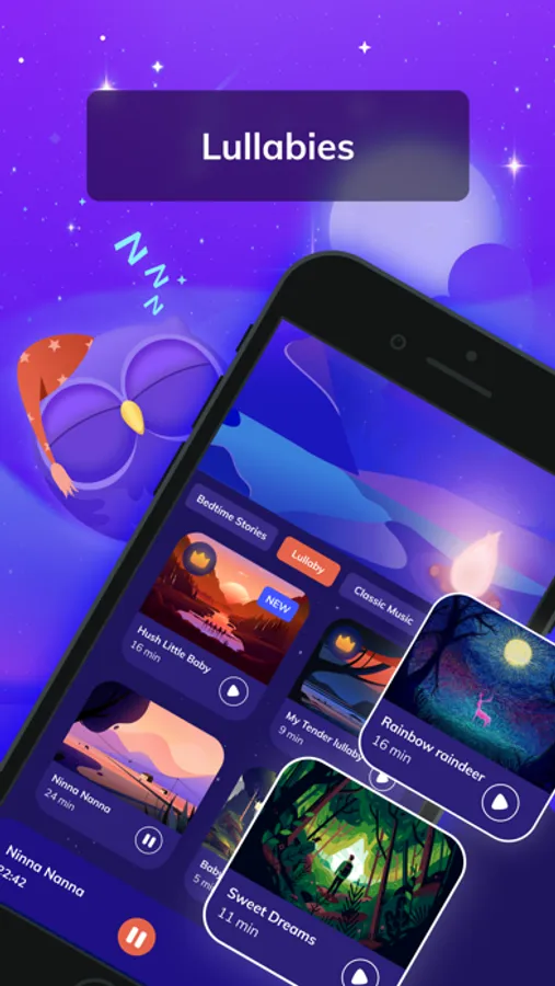 Access various relaxing sounds, lullabies, music, & bedtime stories.