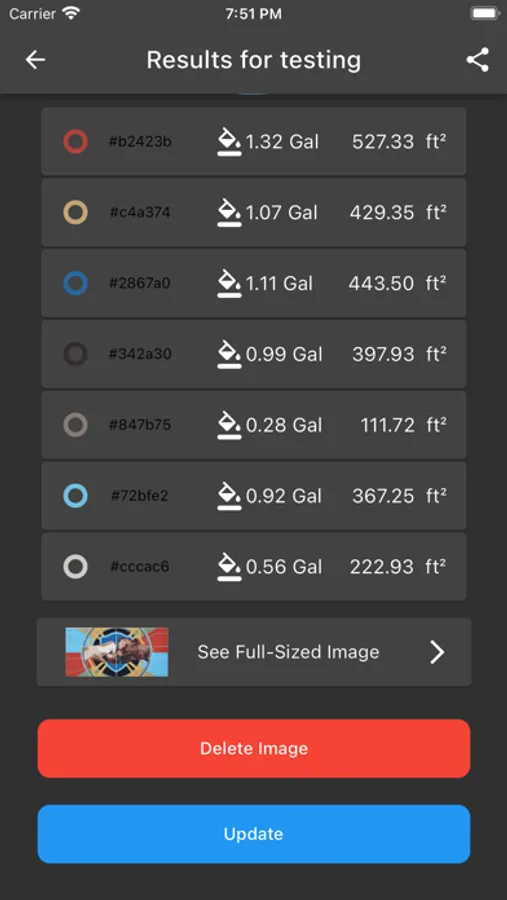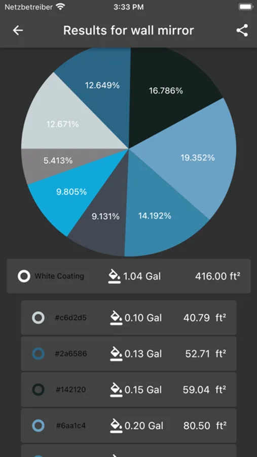 Receive a comprehensive breakdown of required paint amounts for each color.