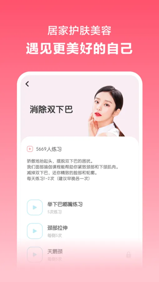 专注于脸部衰老与塑形课程, 是一款个性化的美化脸部锻炼应用程序,旨在通过提供独家定制的脸部瑜伽课程为您提供完美的容貌。每天仅需5分钟keep一下,通过自然健康的系统性课程,帮助你摆脱大眼袋、双下巴和皱纹的困扰,重新召唤完美童颜!让我们通过面部瑜伽进行自然清新的面部护理吧!