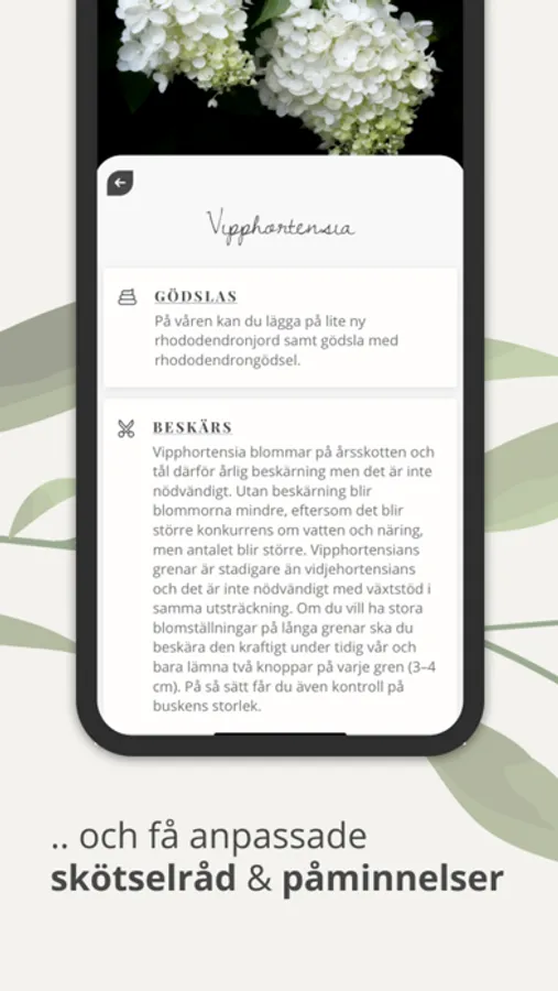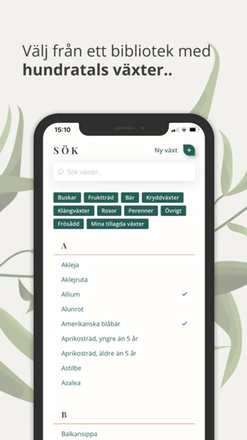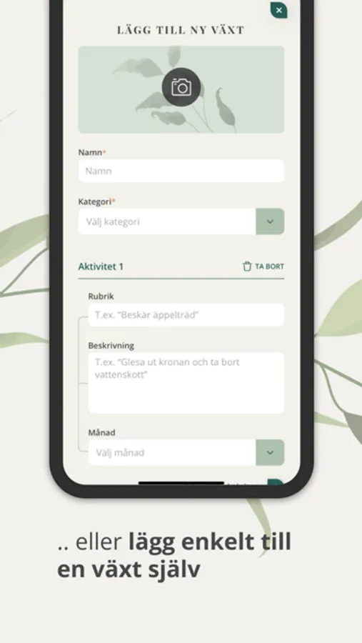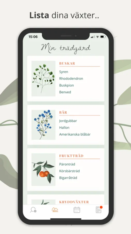 Välj vilka buskar, perenner, träd och andra växter du har och lägg till dem i appen. På så sätt blir kalenderns att-göra lista anpassad efter just din trädgård. Har du en ovanlig växt som inte finns med i vårt omfattande bibliotek, så lägger du bara till den själv.