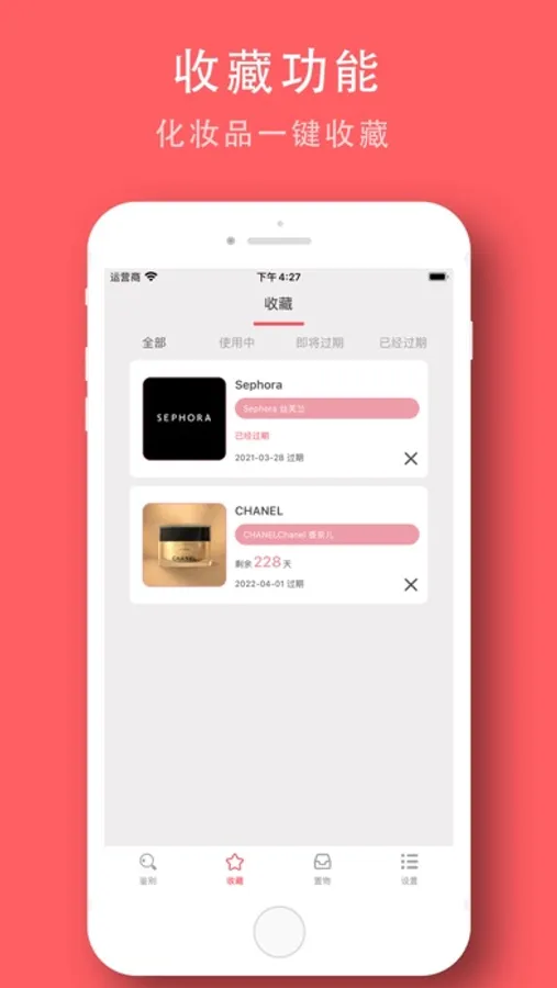 3、护肤品管理: 添加多个护肤品后,可直观的管理每个有效期;