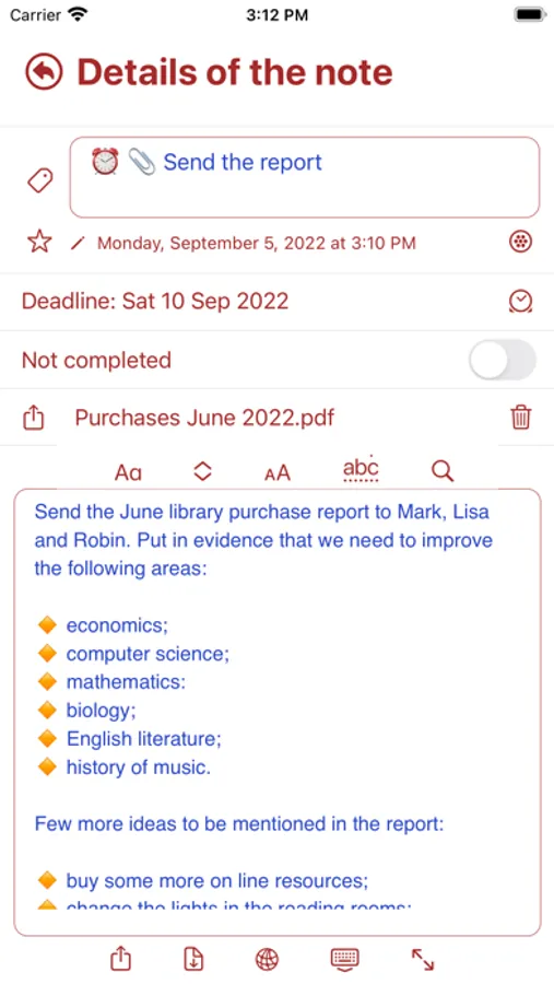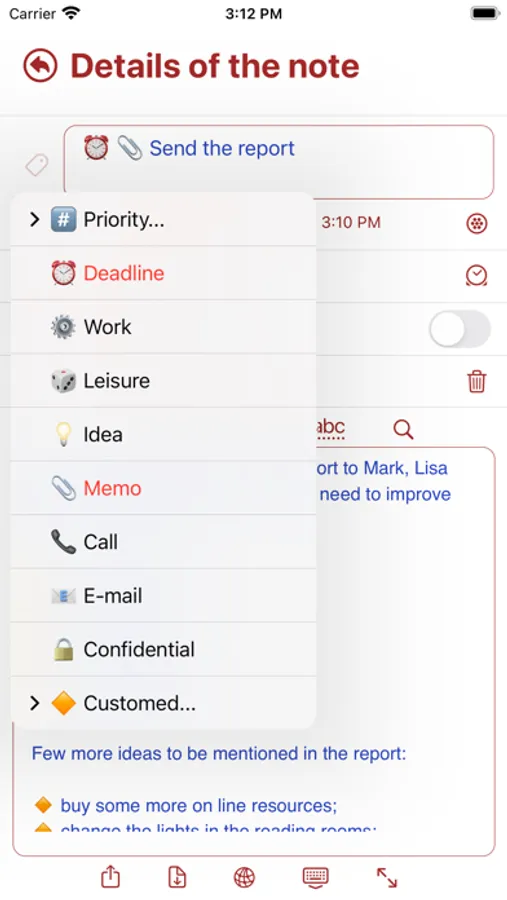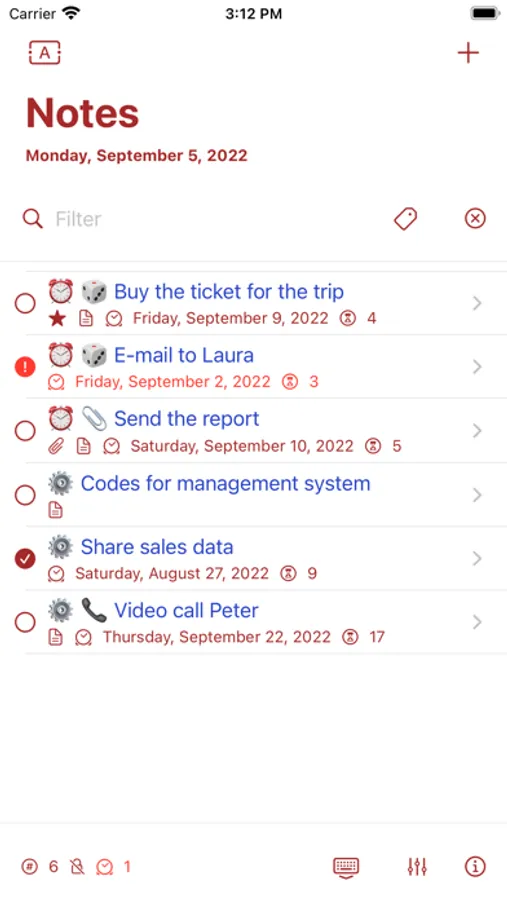 The notes can be tagged with predefined or custom tags, sorted and filtered very easily. They may also be synchronized with the Apple calendar, if the user allows this, or imported from and exported to Apple Reminders.