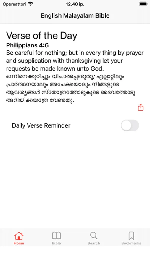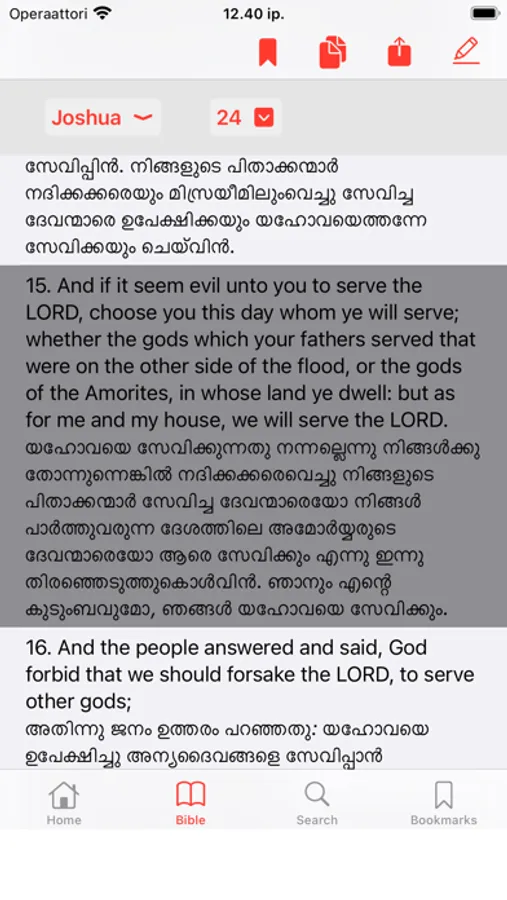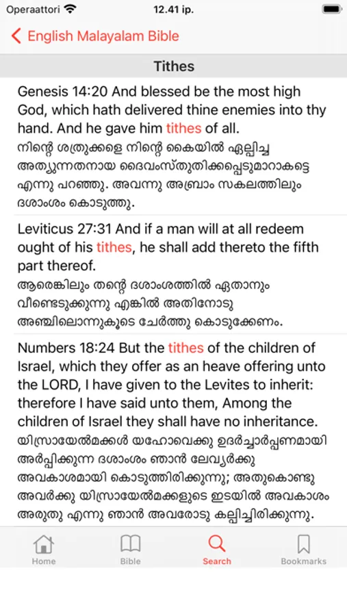 An English with Malayalam parallel version Holy Bible that is completely offline. This is the only Bible app you'll need when attending a church service or personal devotion. You can highlight, copy, bookmark or share verse(s).