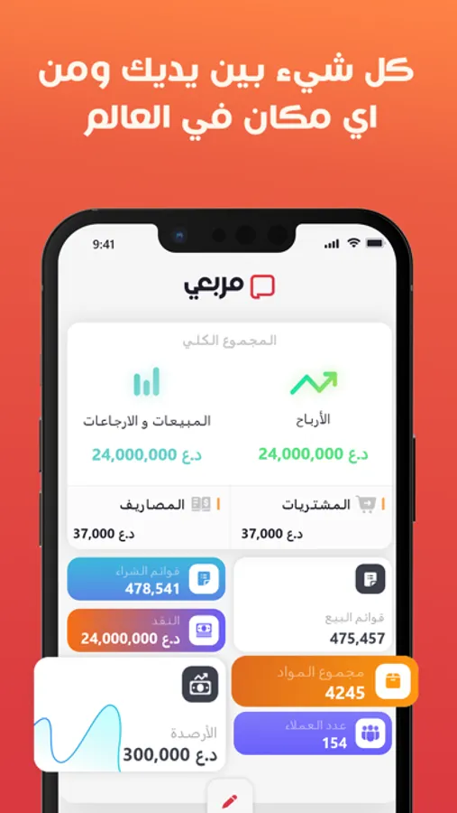 ١. متابعة ملخص يومي بمبيعات، مشتريات، أرباح ومصاريف الشركة/الشركات الخاصة بك بتفاصيل دقيقة للعمليات مع مخططات توضيحية بفترات زمنية مختلفة لمتابعة نمو الشركة على المديين القريب والبعيد