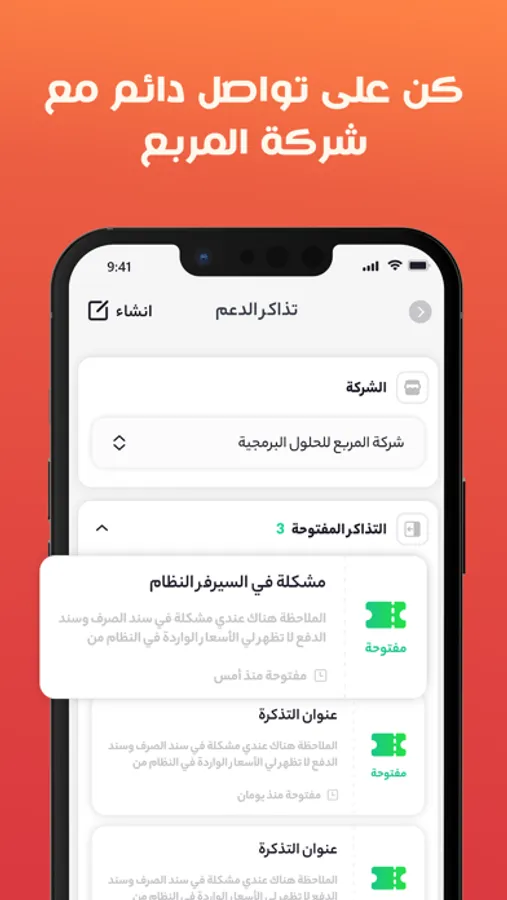 ٤. إنشاء ومتابعة تذاكر الدعم التي تعتبر وسيلة حديثة لطلب الدعم من الشركة دون الحاجة للإتصال الهاتفي. يمكنك إرسال تفاصيل، صور وتسجيل صوت وكذلك الرد على التذكرة ومشاهدة ردود موظفي الدعم الفني