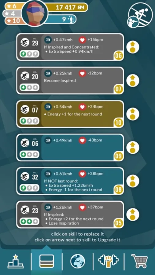 - Skills: more than 60 skills can be used during a race. There are common, rare and epic skills. All skills can be upgraded