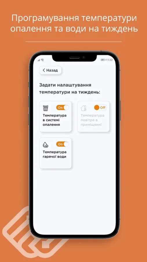 Turn the water heating mode on and off. We program the water temperature for a week ahead.
