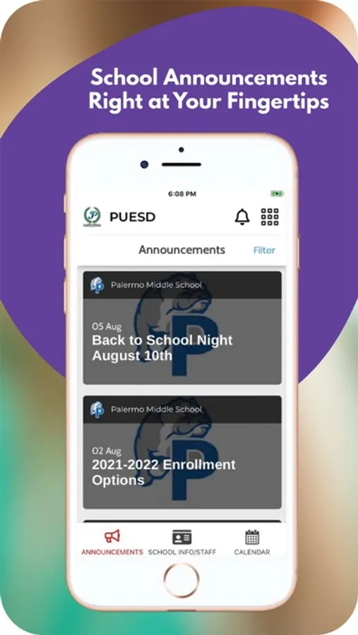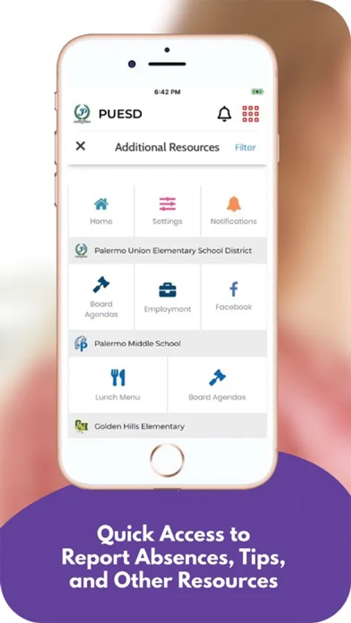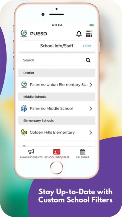 The app includes information for the district and all schools. Filter by the school your child attends to feature information for that school.