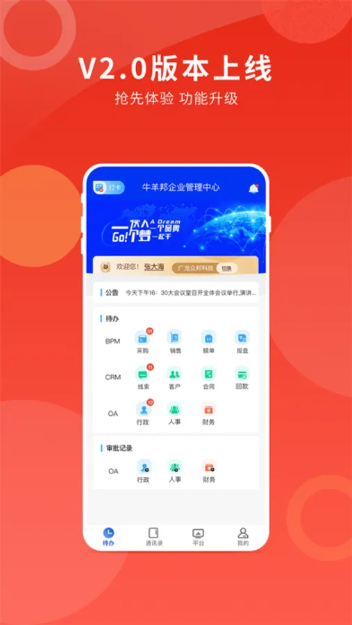牛羊邦企业中心是面向企业用户打造的一款企业管理软件。通过整合业务管理系统、客户管理系统、办公管理系统相关功能模块,帮助企业搭建数字化运营体系。