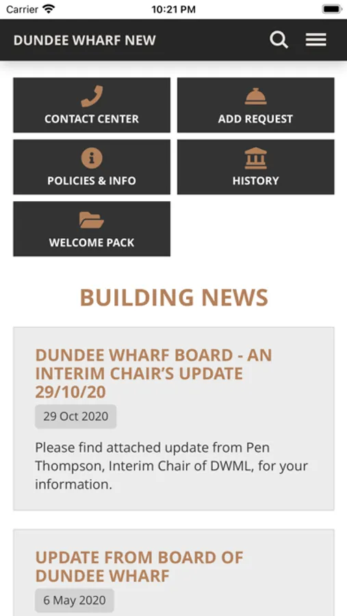 – Is the building’s summary page. It shows the latest stories, details of contacts and requests, forthcoming dates, and useful web-links.