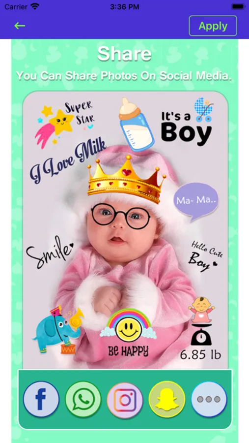 New moms & expectant parents can easily add doodles, artworks,texts, captions,quotes on their cute baby's photo and share it via Instagram, Facebook, Twitter. You can also apply magical filters to make adorable memories with your baby.