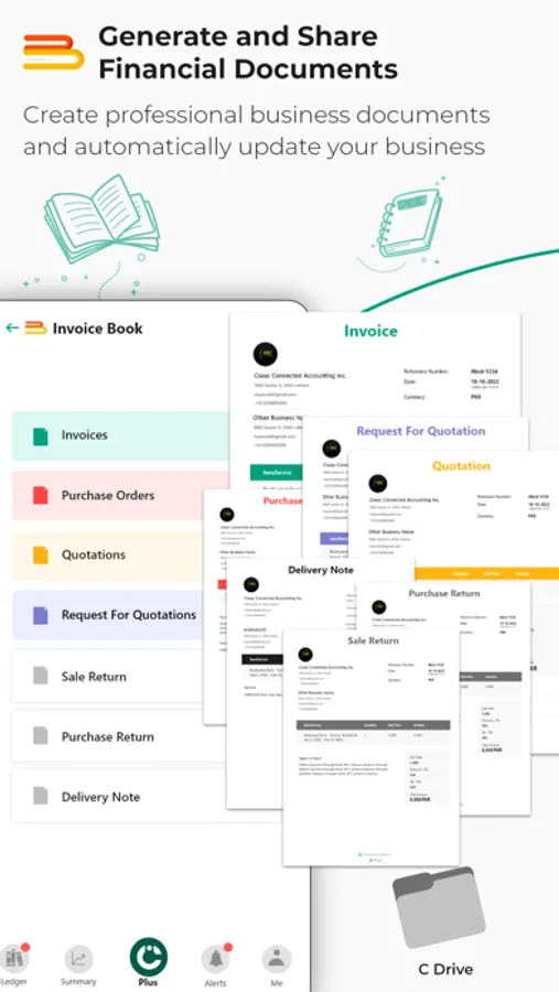 Businesses can generate Invoices, Purchase Orders, Quotations, Requests for Quotation, Sales Returns, Purchase Returns, and Delivery Notes. They can insert electronic signatures and stamps on these documents.