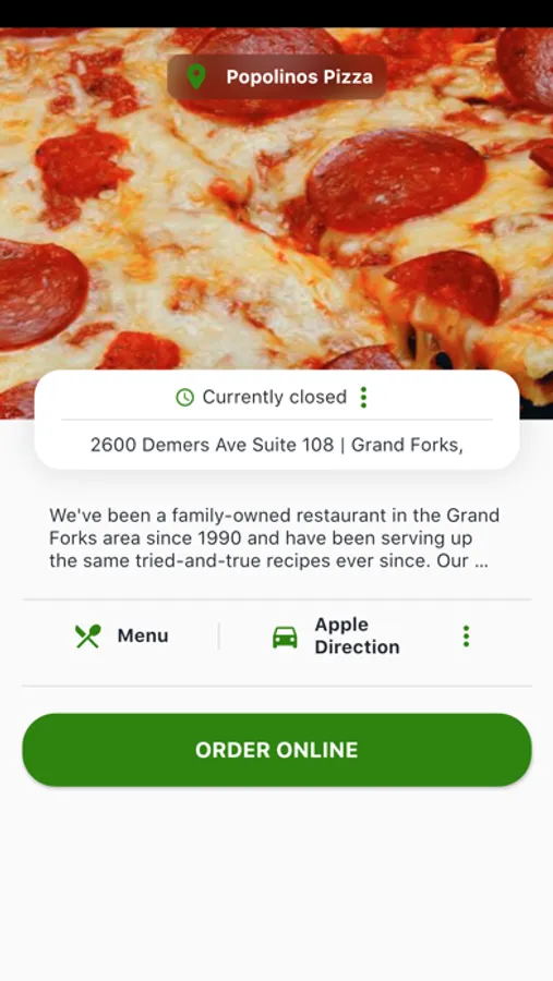 Popolino's pizza restaurant app has many different functions. It contains an online ordering link, restaurant images, address and driving directions, store hours, menus, and many other great features.