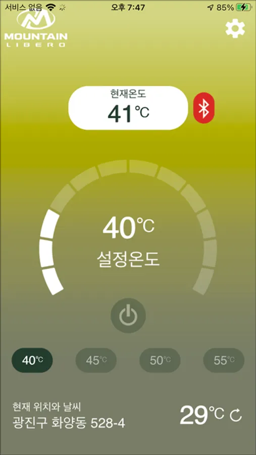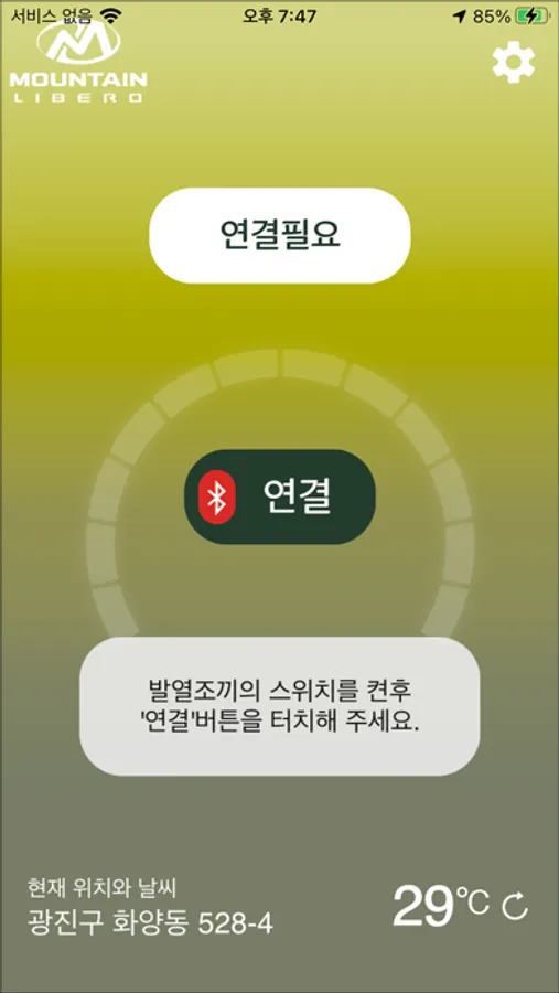 MOUNTAIN LIBERO(마운틴리베로) 발열 조끼 어플리케이션은 스마트폰을 이용하여 사용자가 발열패드 온도를 선택하고, 제어하는 기능을 제공합니다.