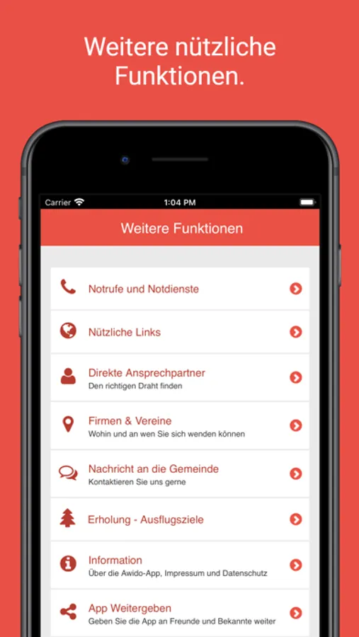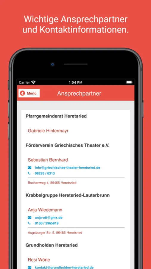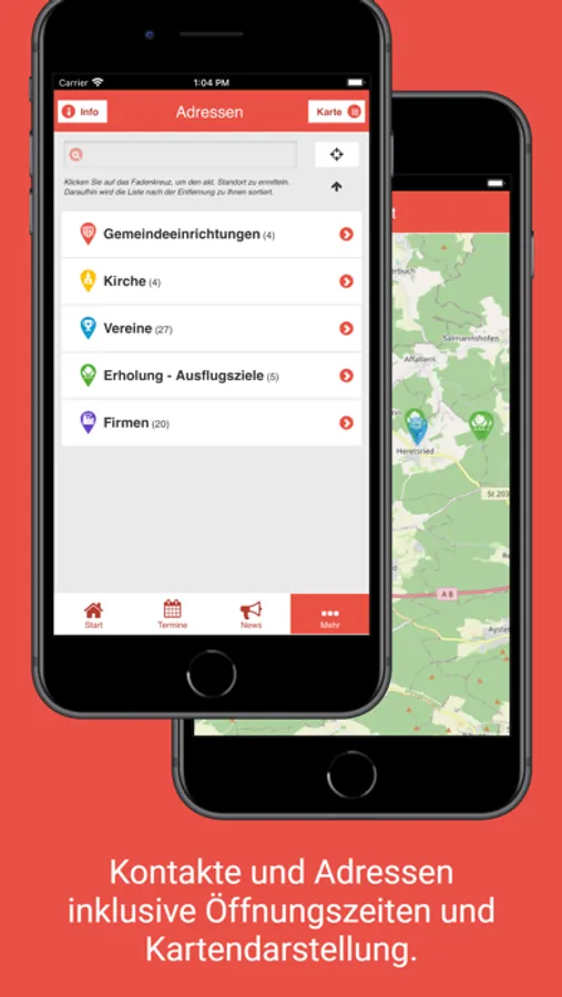 * Kontakte und Adressen aller Art inklusive Öffnungszeiten und Kartendarstellung.