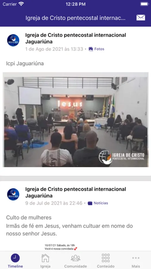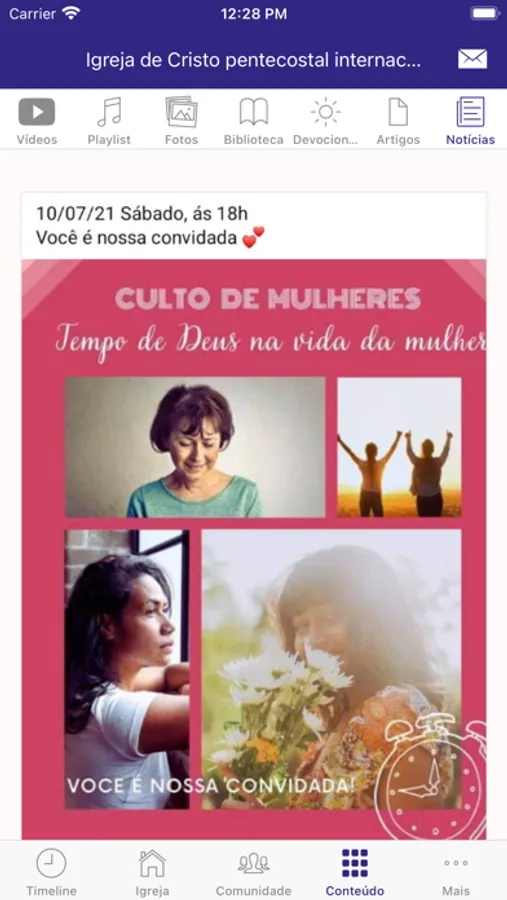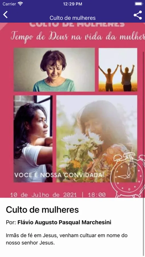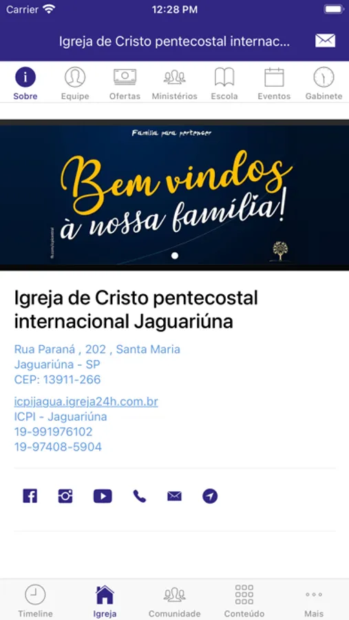 - Informações da Igreja (endereço, telefone, site, redes sociais, pastores)