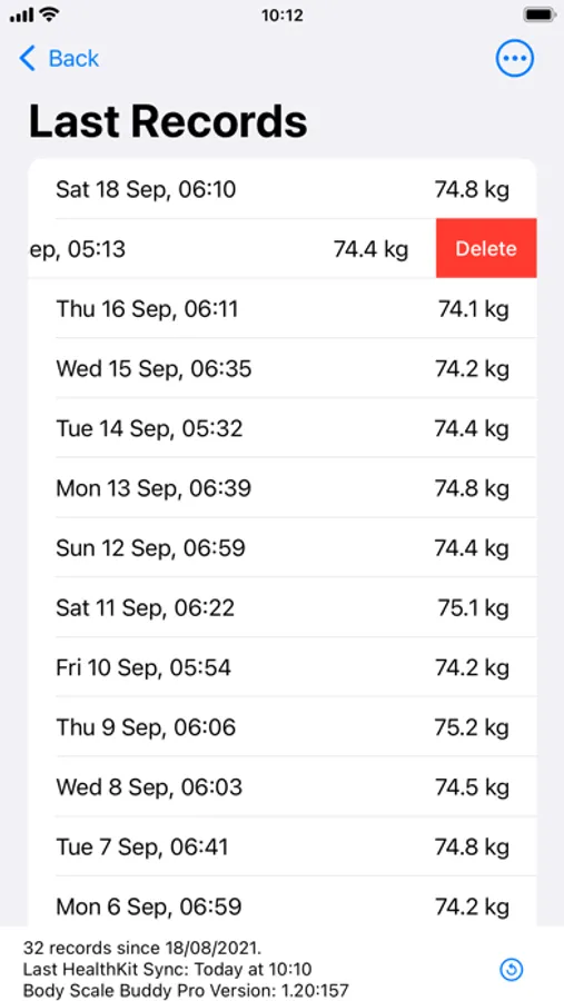 List of recent body weight records with swipe-to-delete (iPhone: adjustable date range, Apple Watch: last 8 days).