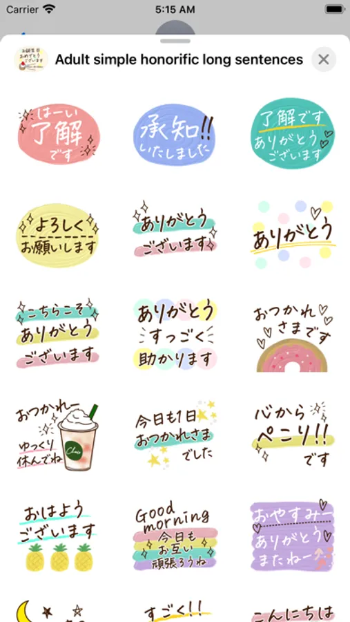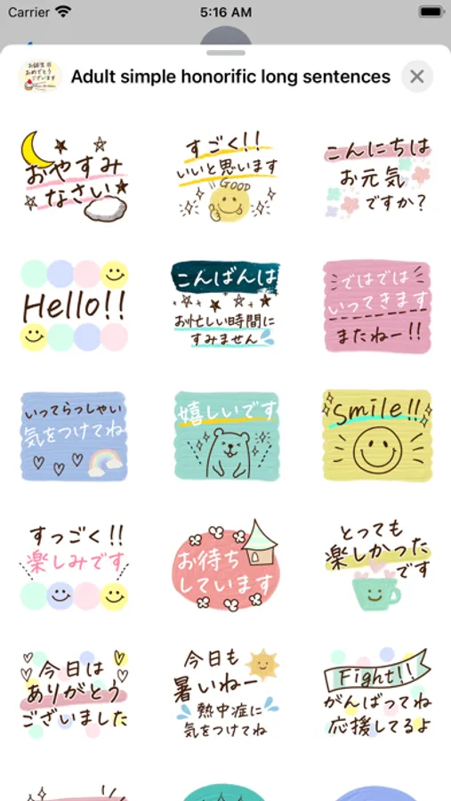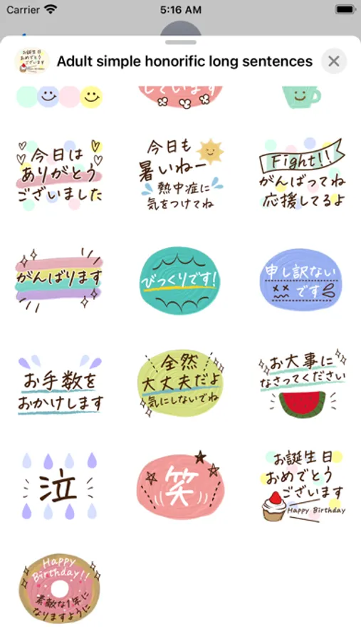 It is a long sentence sticker set with commonly used honorifics in a simple handwritten font with no character for adults.