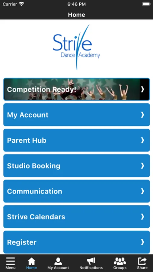 The Strive Dance Academy app allows you to manage your account, register for classes, and receive video postings and rehearsal clips all in one location.
