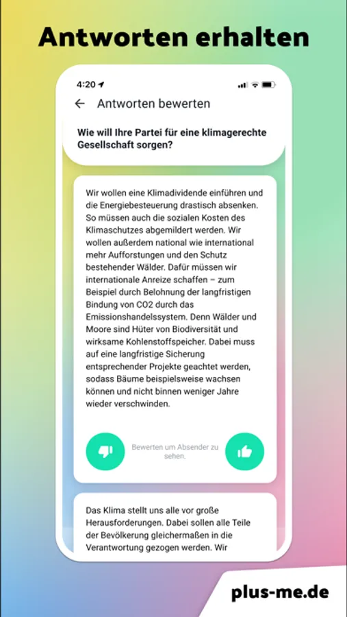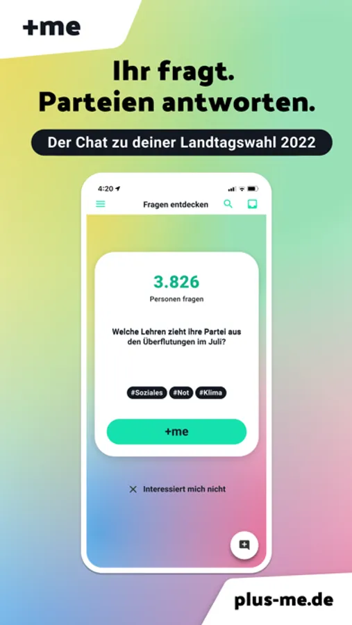 Nach dem Superwahljahr 2021 wird auch 2022 wieder gewählt. Es finden vier Landtagswahlen statt. Über +me kannst du deine Fragen an die Parteien in deinem Bundesland stellen oder Fragen von anderen deine Stimme geben. Die beliebtesten Fragen werden dann von den Parteien beantwortet. Bevor du aber siehst, von welcher Partei welche Antwort stammt, musst du diese bewerten. So findest du die Partei, die auch wirklich zu dir passt.