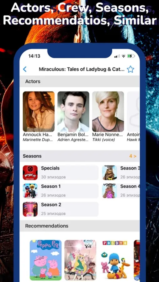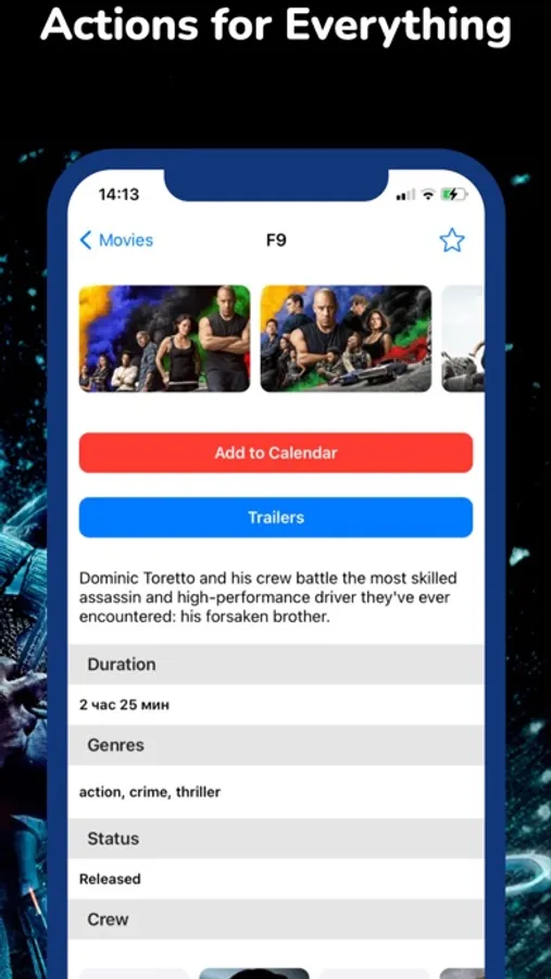• All movie details, crew, actors, seasons and episodes.