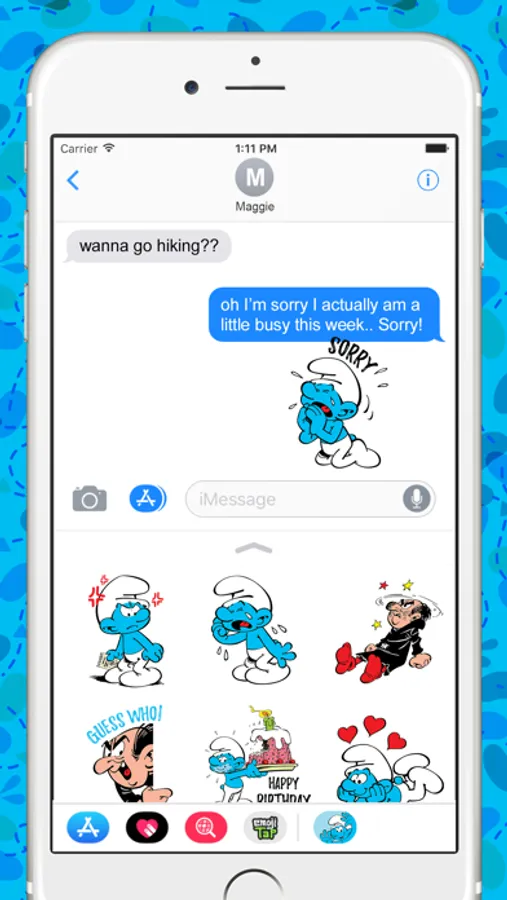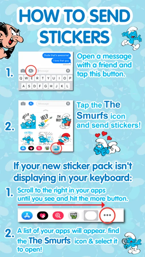 Send messages the Smurfy way! These classic stickers feature your favorite Smurf characters, and are ready to adventure through your phone and liven up your conversations! Pack includes 24 static stickers.