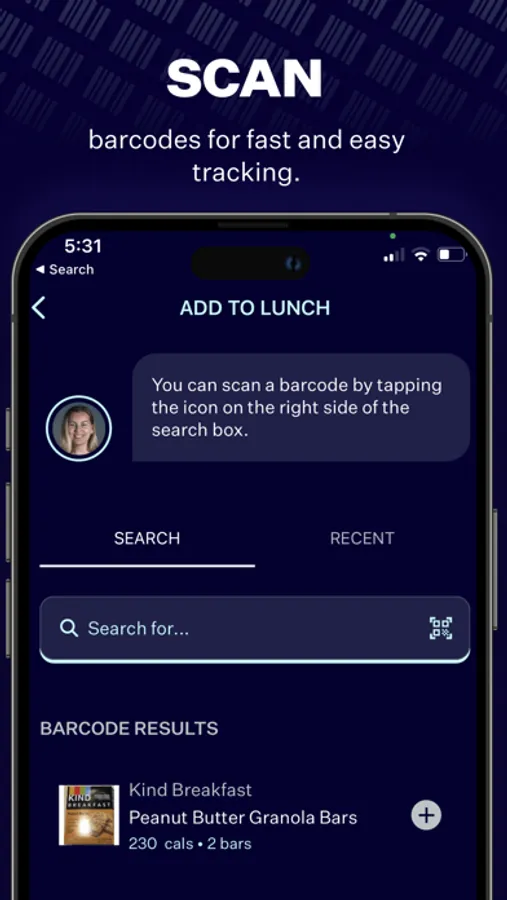 - Barcode scanner - quickly track foods you have eaten by scanning our vast database of product barcodes