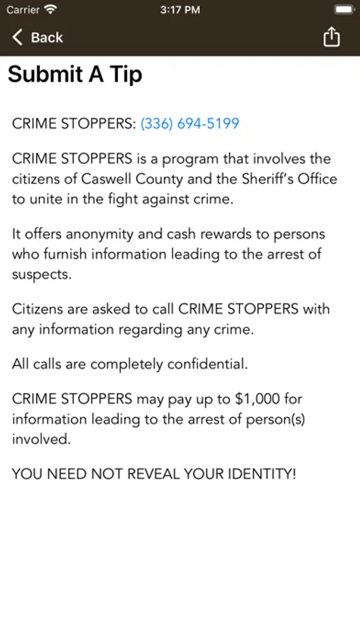 The Caswell County Sheriff’s Office mobile application is an interactive app developed to help improve communication with area residents. The Caswell County Sheriff App allows residents to connect with the Caswell County Sheriff’s Office by reporting crimes, submitting tips, and other interactive features, as well as providing the community the latest public safety news and information.