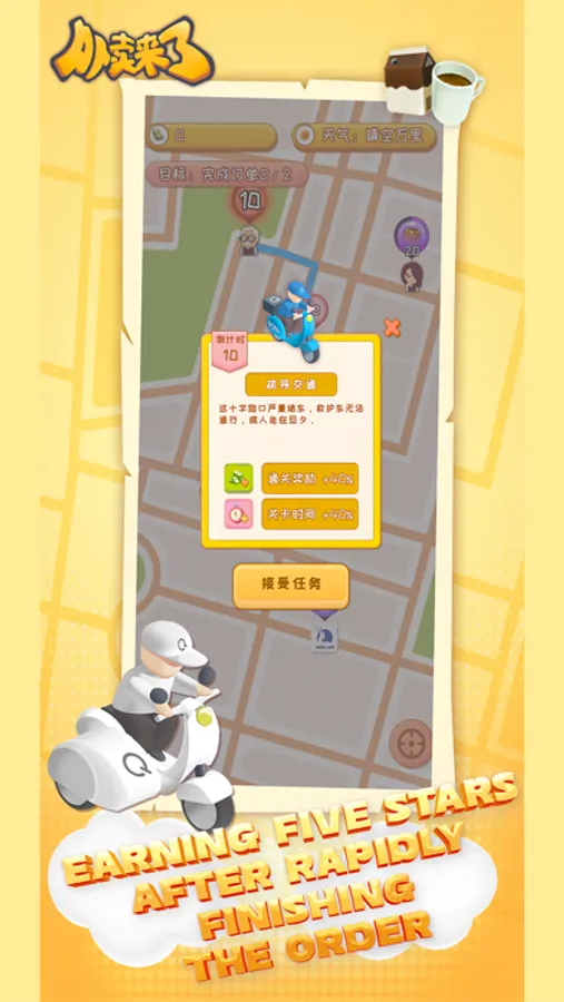 Takeaway Coming Is a casual game that simulates various real situations that takeout boys encounter when delivering food. Each level has different delivery time and route, and the delivery time required by each customer is inconsistent. Players need to carefully plan the route of picking up food and delivering food.