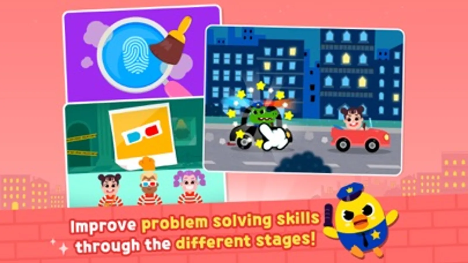 Pinkfong's Police Heroes Team are on their mission to catch the true thieves. Help them out by examining clues and solving problems!