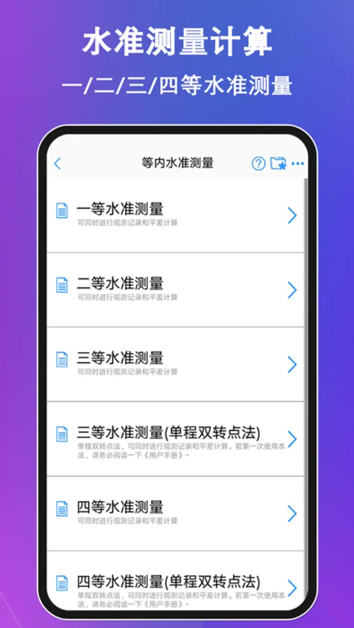 软件支持国家一/二/三/四等水准测量,且包含三四等水准测量中的单程双转点法,功能强大全面。