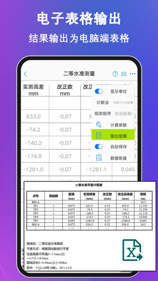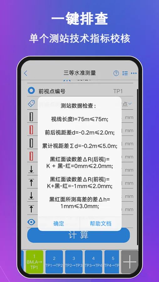 过去,我们一般习惯于使用纸质的手薄记录外业数据,最后统一数据汇总进行内业计算。本软件鼓励用户直接使用手机进行测量数据的记录,在记录数据的同时,本软件会自动进行测站观测数据的校核,如果超限会及时报警提醒用户。当记录完成后,一键点击计算,就自动完成了内业平差处理。最后,可以将数据导入到电脑端的软件,自动生成观测手薄和平差计算表。