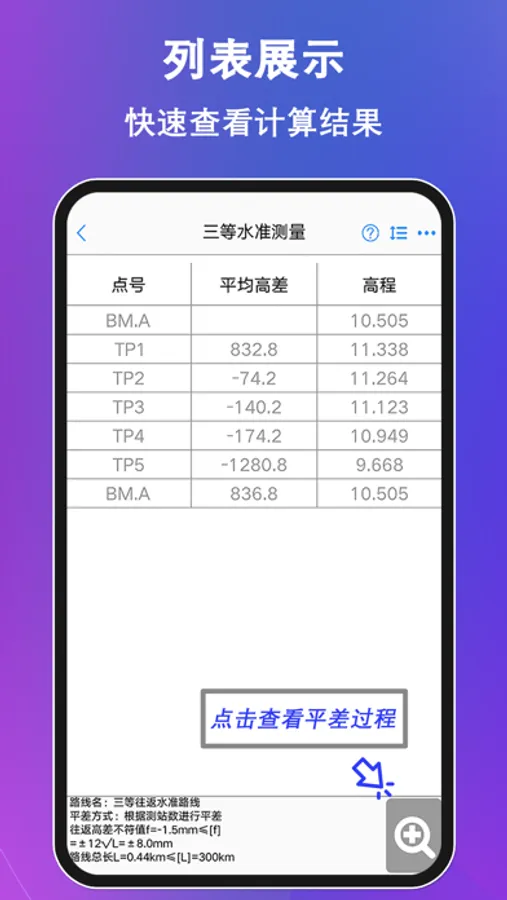 (4)详细计算功能:点击计算按钮后再点击“放大镜”按钮可详细查看平差计算过程;