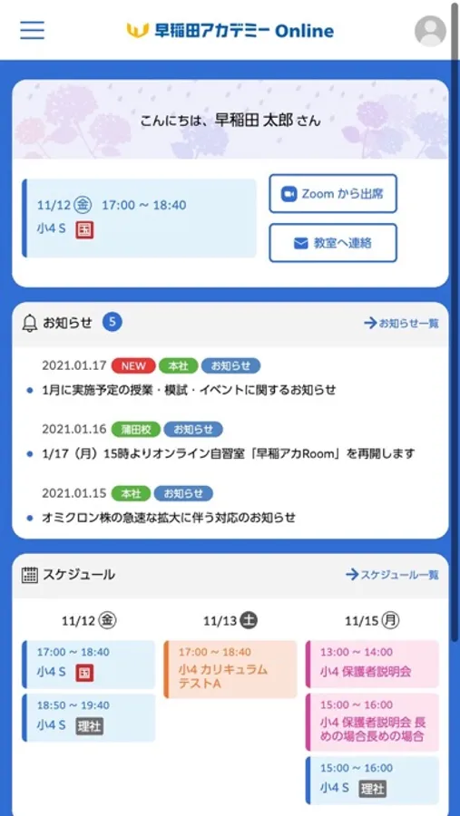 早稲田アカデミーでは、オンデマンド映像、オンライン授業、模擬試験のWeb帳票、各種手続き用サイトなど、さまざまなWebサービスを提供しております。早稲田アカデミーOnlineにログインし、利用したいサービスを選ぶだけで、ワンストップでほぼすべてのWebサービスをご利用いただけます。ご兄弟でご通塾の場合、一つのアカウントでまとめて管理することも可能。お子様にも保護者様にも使いやすいサービスです。授業の受講、模擬試験の受験に欠かせない早稲田アカデミーOnline、ぜひご活用ください。