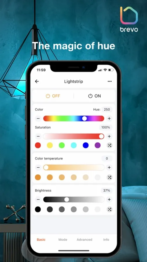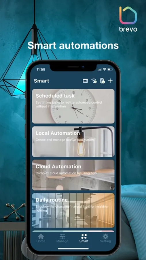 The Brevo Smart app features full control of the Brevo smart lights and accessories. You can control brightness, temperature and color of your lights, you can organize smart lights into groups and control them away from home, you can personalize your lighting scenes and illuminate your home in an instant, you can create routines and schedule the automation.
