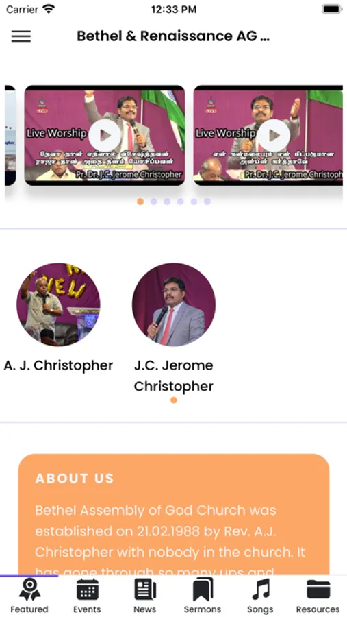 The events and news sections give you a quick glimpse of what's coming in the current week and the highlights of what happened in the previous one. This helps you in planning to attend any event and also gives you an opportunity to be informed about what your church had been doing in the past week. The image carousel (Featured Images Section) in your home screen brings you to the key events through photos – a great way to take a digital peep into your church.