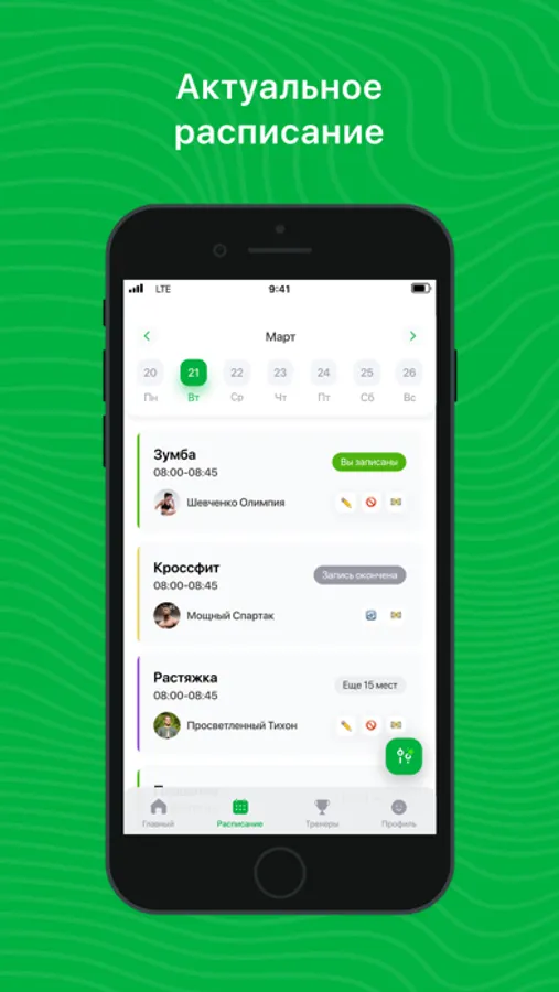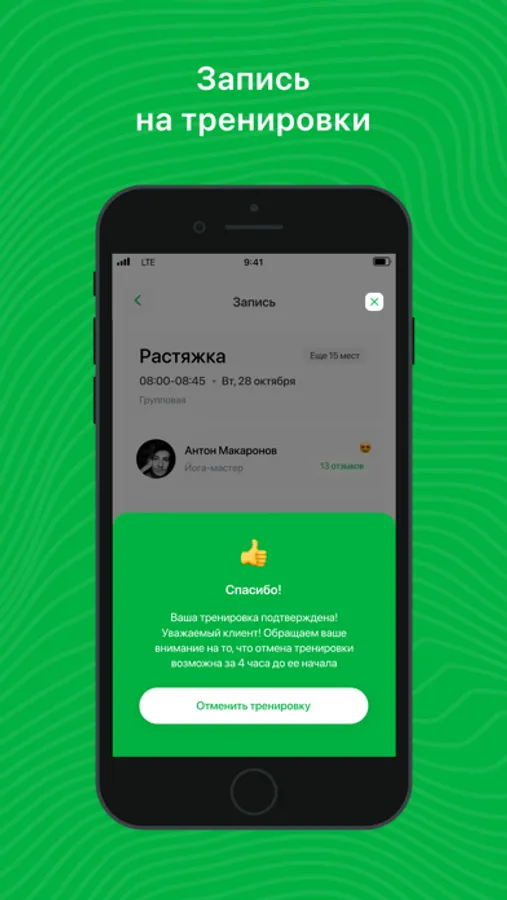 - Получать PUSH-уведомления о предстоящих тренировках.